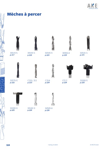 Mèches à percer 30540-5 30566-5 30540-6 30566-6 30555-5 p.117 p.118 p.119 p.120 p.121 30570-5 C310, 311 C314 C512 30300-5 p.122 p.123 p.124 p.124 p.125 30300-6 30540-9 30565-9 p.125 p.126 p.126 116 Cutting & better © AKE France