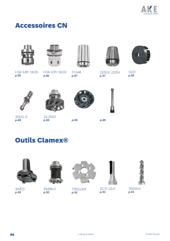 Accessoires CN HSK 63F/ SK30 HSK 63F/ SK30 21048 21053/ 21054 1022 p.86 p.86 p.87 p.87 p.88 39191-0 29-0100 p.88 p.89 p.89 p.89 Outils Clamex® 9A423 39498-0 73511004 22-9/ 22-6 30569-6 p.90 p.90 p.91 p.91 p.91 84 Cutting & better © AKE France